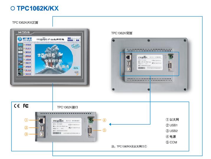 TPC1062KX,是一套以嵌入式低功耗CPU为核心(ARM CPU,主频400MHz)的高性能嵌入式一体化触摸屏。该产品设计采用了10.2英寸高亮度TFT液晶显示屏(分辨率800×480),四线电阻式触摸屏(分辨率1024×1024)。