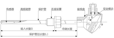 ![]() 1、基本结构:传感器+(连接装置+接线盒+保护管)+变送模块 2、长度表示方法:L=保护管总长×插入长度(单位:mm,密封面以下为插入长度) 3、冷端长度的确定:由于确定了保护管的总长度和插入长度,也就确定了保护管非插入部分的长度,即冷端长度。冷端长度标准为150mm;低于125℃的温度测量,看温度对冷端影响情况可以适当加长,如250mm或者300mm。 4、冷端长度的用途: a、变送模块的工作温度为-10~75℃,通过冷端长度使温度场到接线盒之间的传导和辐射温度降低,保护了变送模块的电路。 b、如果采用热电偶传感器就必须要有冷端长度。 c、保护接线端和线缆。 |